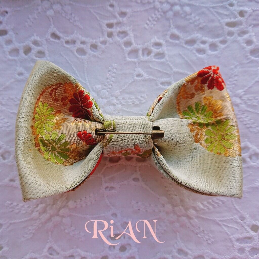 【商品説明】帯の生地で飾りリボンを制作しました。安全ピンになりますので、帯や鞄につけていただくこともできます。帯の生地になりますので、1点ずつの商品になります。
